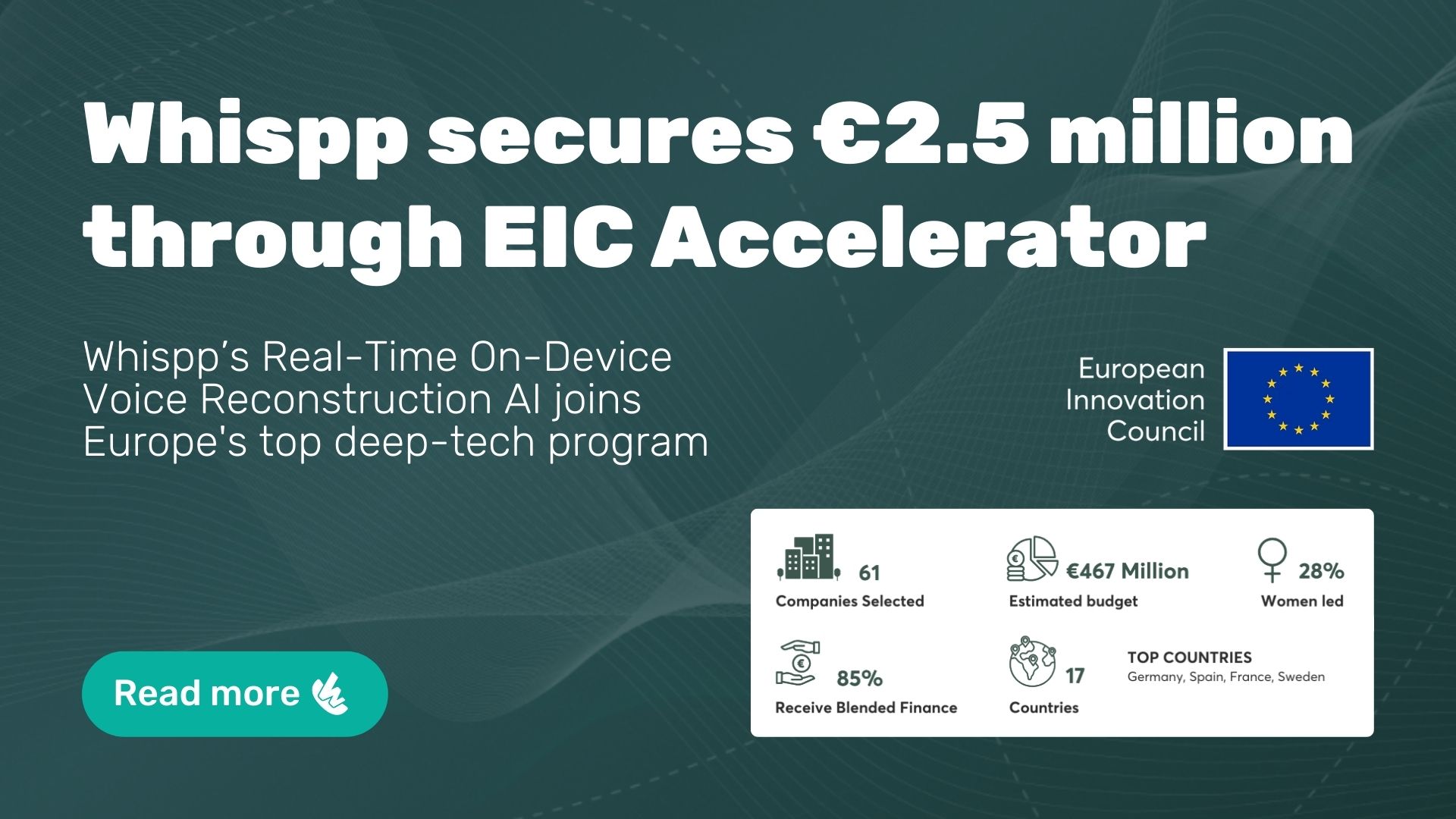 The EIC – European Innovation Council Accelerator is the flagship program for high-risk, deep-tech startups. Whispp secured a €2.5M grant, alongside a commitment for equity investment in a next phase.